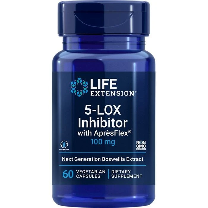 Life Extension 5-LOX Inhibitor with ApresFlex Capsules – ApresFlex absorbs 52% more than standard boswellia extract and is standardized for the active AKBA compound is the key to this beneficial action. The compounds present in boswellia extract have been shown to bind directly to 5-LOX, an enzyme that transforms fatty acids into inflammatory factors like leukotriene B4. Each 100 mg vegetarian capsule of 5-LOX Inhibitor with ApresFlex is standardized to provide 20% of active AKBA from boswellia.