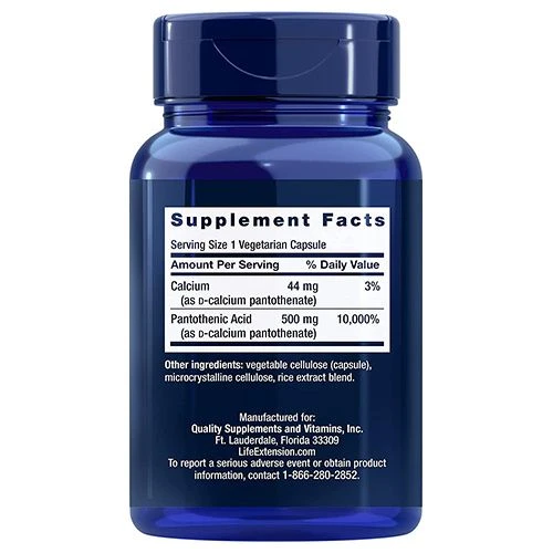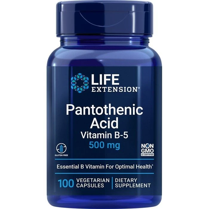 Life Extension Pantothenic Acid Capsules- Pantothenic acid (vitamin B5) is an important component of coenzyme A, which assists in several metabolic pathways and is necessary for the transfer of fats to and from cells. Pantothenic acid (vitamin B5) is critical for human health. As a component of a ubiquitous cofactor called coenzyme A, it plays a central role in lipid, amino acid, and glucose metabolism, and mitochondrial energy production, as well as in the synthesis of hemoglobin, neurotransmitters, cholesterol. steroid hormones, and other proteins and lipids.