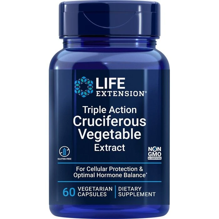 Life Extension Triple Action Cruciferous Vegetable Extract Capsules – Triple Action Cruciferous Vegetable Extract combines plant extracts derived from leafy green cruciferous vegetables. This comprehensive, food-based formula promotes cellular health and already healthy hormone levels. Maintaining healthy hormone levels is essential to any comprehensive whole-body health strategy. This supplement combines extracts of broccoli, cabbage and other phytonutrients to help maintain already healthy hormone levels.